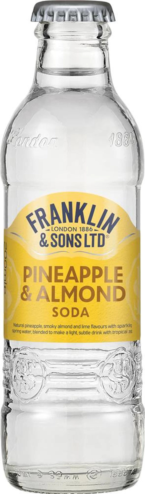 Franklin & Sons Pineapple & Almond Soda er fremstillet med de fineste naturlige ingredienser. Naturlig ananas, lime og mandel er blandet med danskvand for at skabe den perfekte mixer til enhver spiritus eller cocktail. Produktet er omhyggeligt udviklet til at matche og fremhæve spiritussen. Det høje indhold af bobler og de tropiske smagsnoter sikrer, at mixeren både giver kraft og karakter, samtidig med at spiritussen får lov til at træde tydeligt frem.